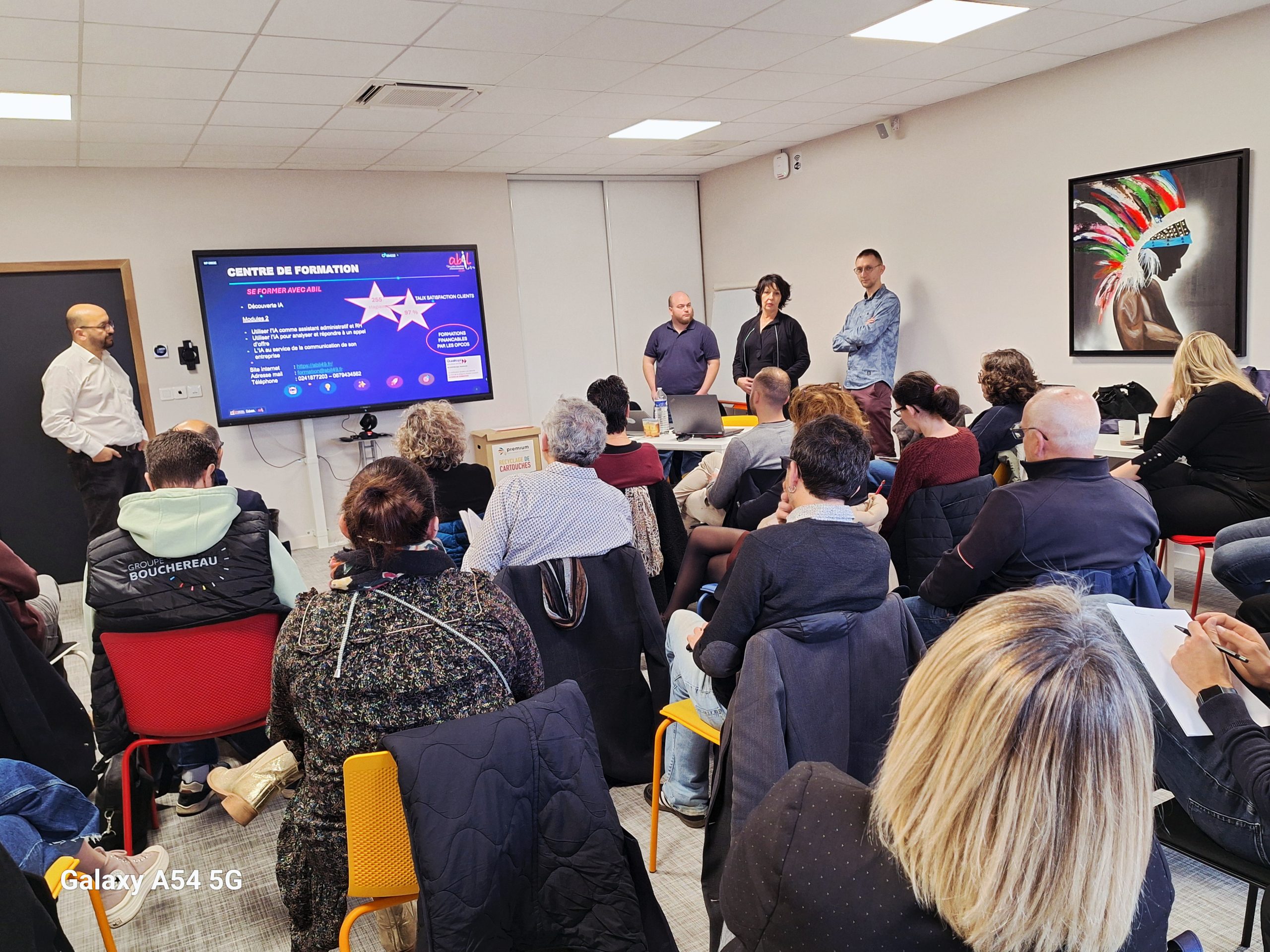 Pour cette première édition, nous avons souhaité un format dynamique et interactif. L’objectif ? Désacraliser l’IA, explorer ses usages quotidiens et comprendre comment elle peut transformer nos métiers. Pour cela, nous avons co-animer cette réunion avec notre partenaire ABIL 49.